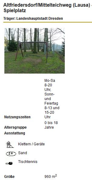 Spiellandschaft/Kombination ist zu eintönig u. unattraktiv. Hangel-, Kletter- u. Kreativ Angebot sollte verbessert werden. Z. B.: Balancieranlage, Kletterpyramide, Wippe, Schaukel, Sandkasten, Motto-Spielgeräte/Landschaft : Piratenschiff, Rakete, Flugzeug, Spielhäuser die das Schul- oder Waldthema aufnemen, Baumhaus in Anlehnung an Weixdorfer Rathaus. Die umliegenden Straßen sind nach Vögel benannt: Stiglitz-, Gimpel-, Kleiberweg...Das Thema könnte auch mit integriert werden. Zudem könnte das Thema Straßenbahn interresent sein (bespielbarer Zug), da sich in der Nähe gleich die Gleisschleife der DVB befindet